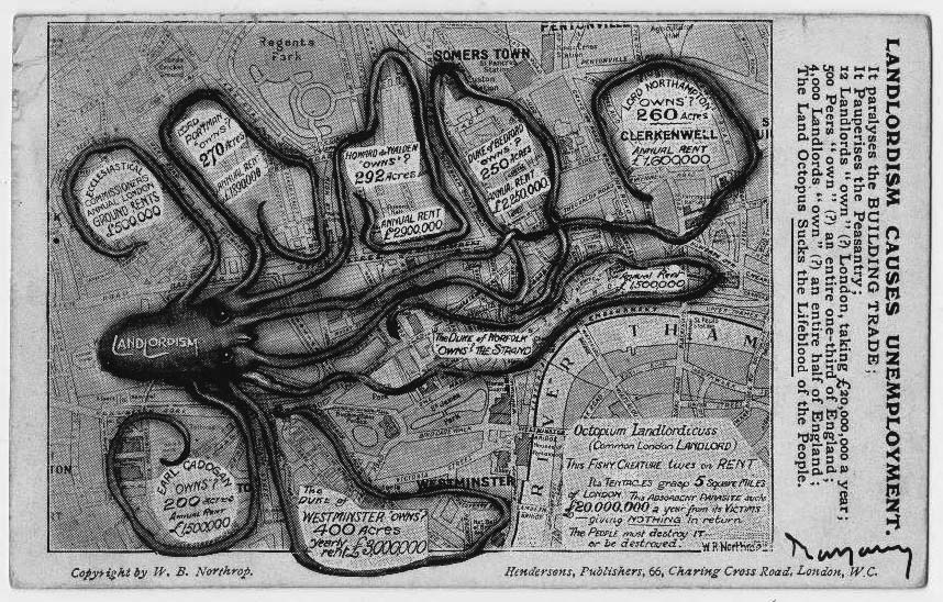 The most lucrative rental income, of course, went to aristocrats who owned land in central London. A 1925 campaigning postcard by radical journalist W.B. Northrop (see opposite) depicts a giant octopus labelled ‘landlordism’, its tentacles spreading through the streets of the capital. Each tendril curls around the boundaries of one of the ‘Great Estates’ that own London, listing their acreages and annual rents. ‘The Land Octopus Sucks the Lifeblood of the People,’ Northrop declared. Tellingly, nearly all of the aristocratic estates shown on the postcard still possess large swathes of the city today. Where they have lost land, they have more than made up for it in soaring property prices on their remaining acres.