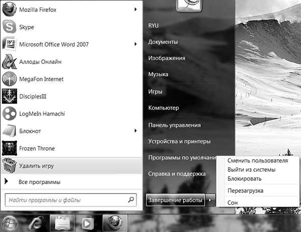 • Выйти из системы – именно нажатием этой кнопки нужно пользоваться для отключения компьютера.