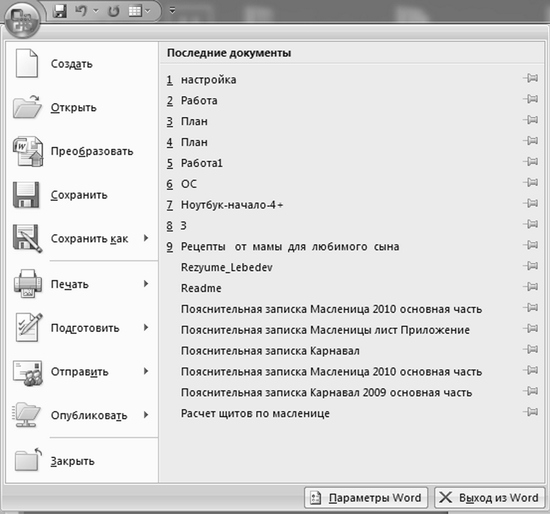 Чаще всего в окне, которое открывается после нажатия кнопки Office, с левой стороны уже содержится список основных используемых вами программ. Вам достаточно просто выбрать нужную (в нашем примере – это Microsoft Word 2007).