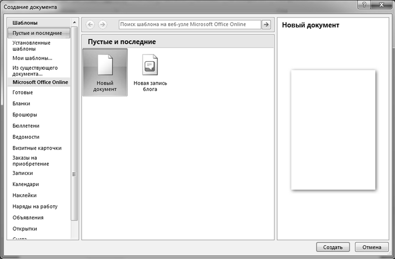 Выбираете в большом окне раздел Новый документ и нажимаете в правом нижнем углу кнопку Создать.