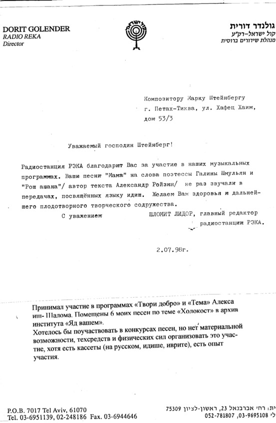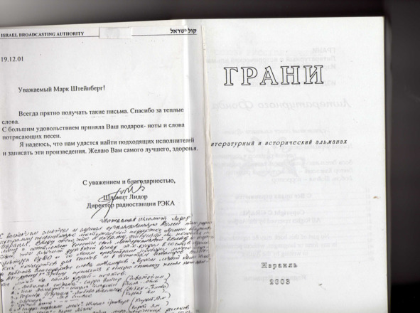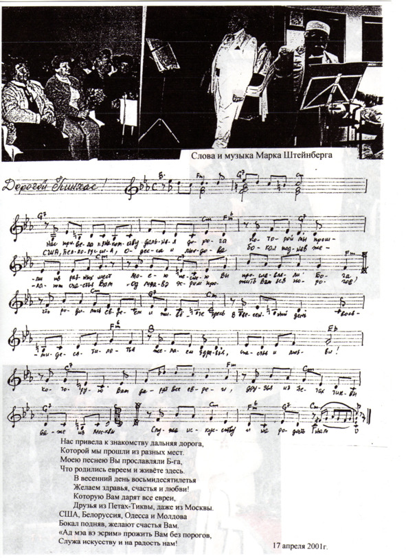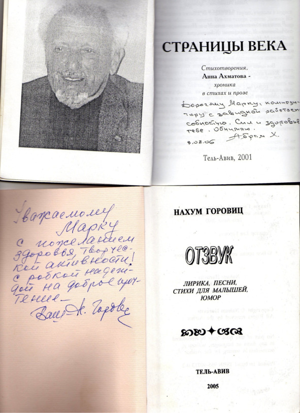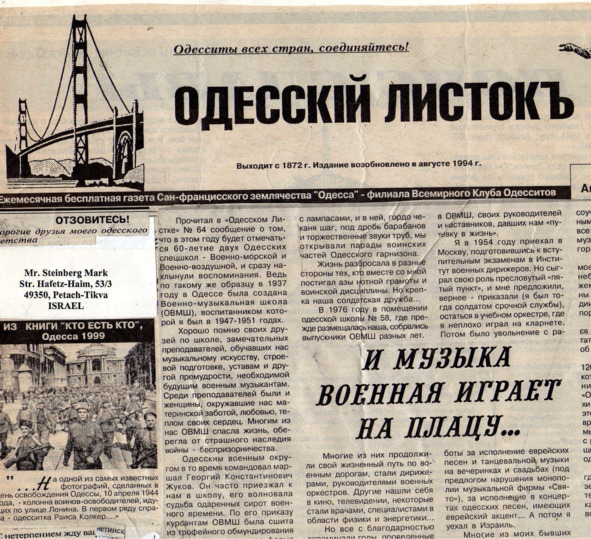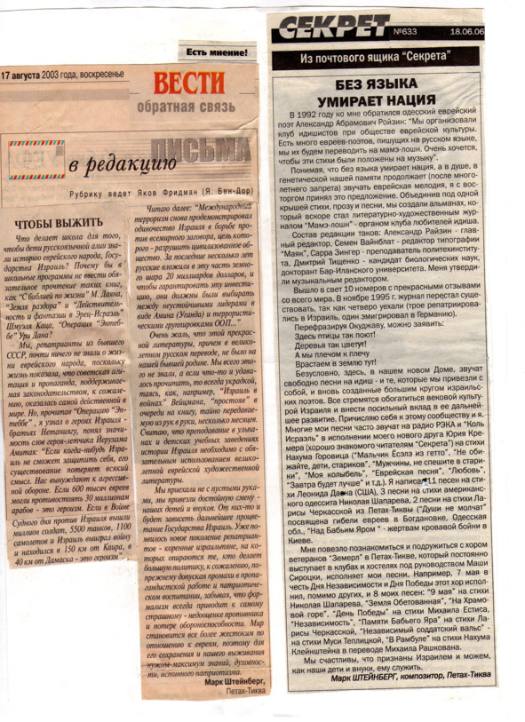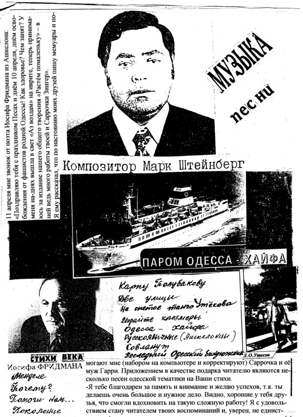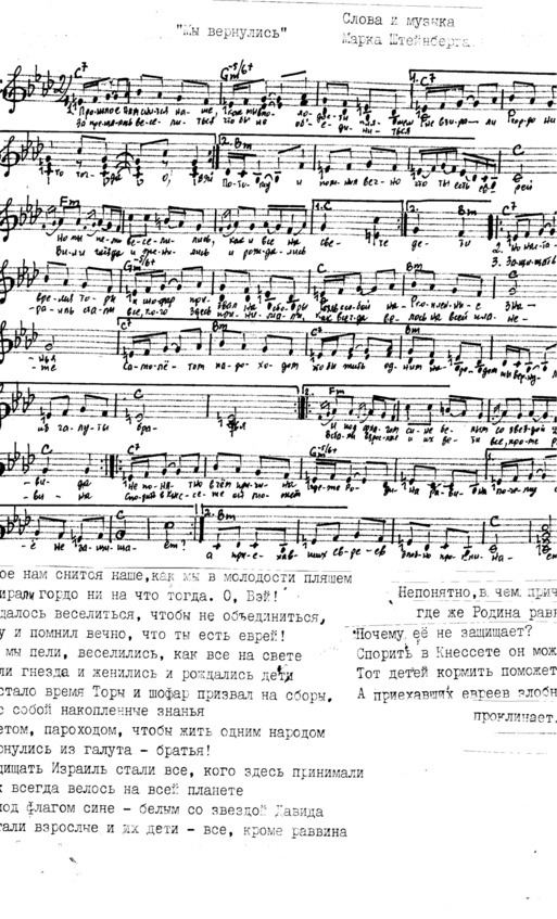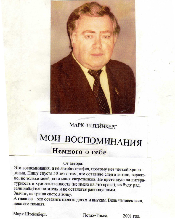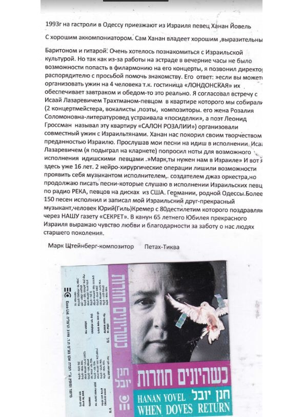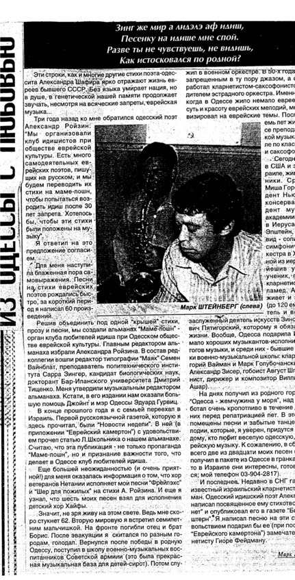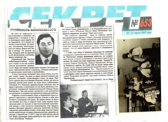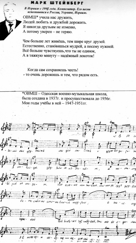 – В «титрах» моих воспоминаний израильского периода жизни Марк Штейнберг – автор многих прекрасных песен не только на русском языке, но и на языке идиш, автор музыкальных сборников, статей и рассказов. О Марке Штейнберге нередко пишут в израильской, украинской и американской прессе.