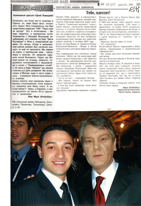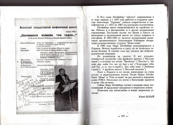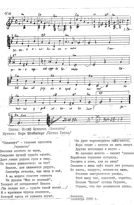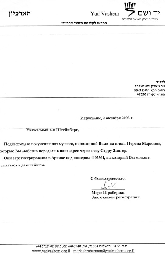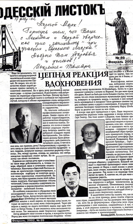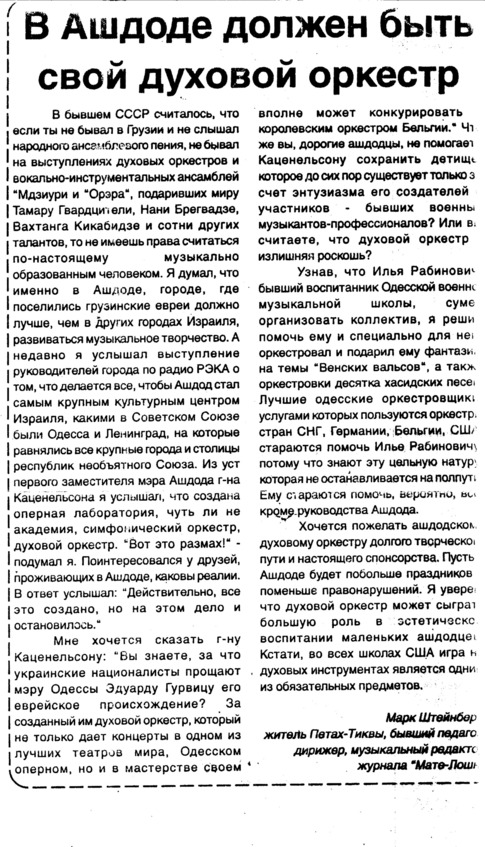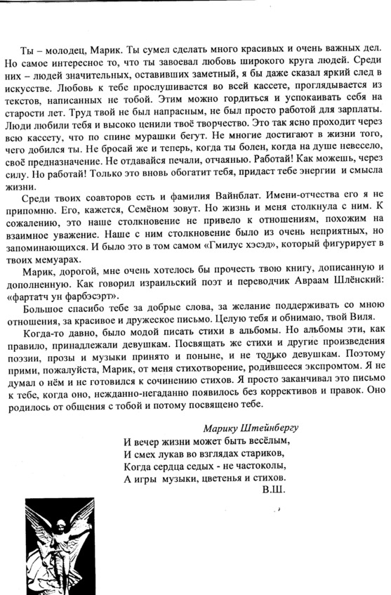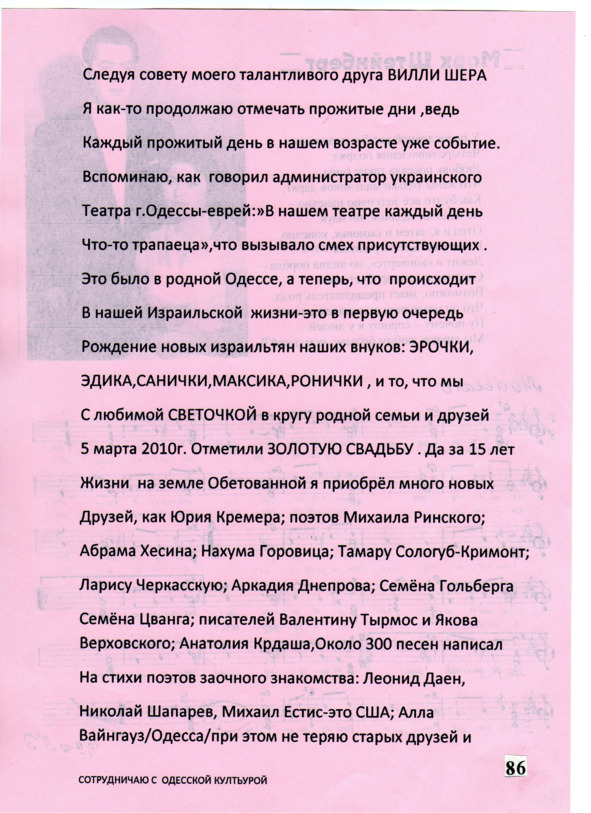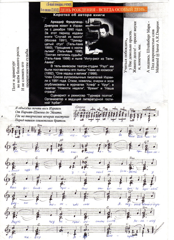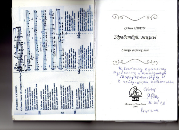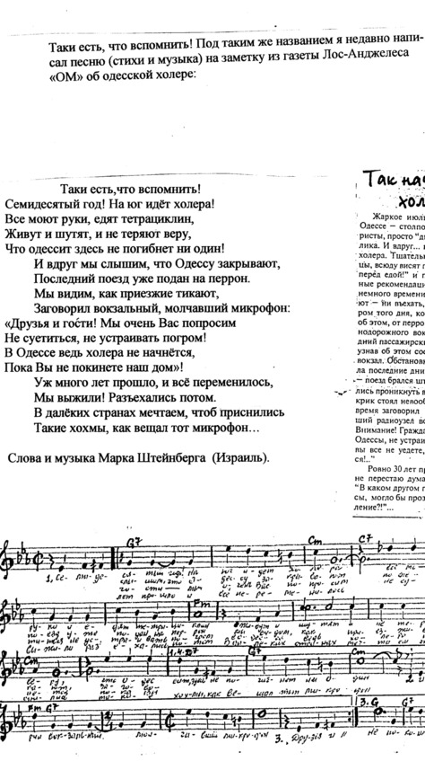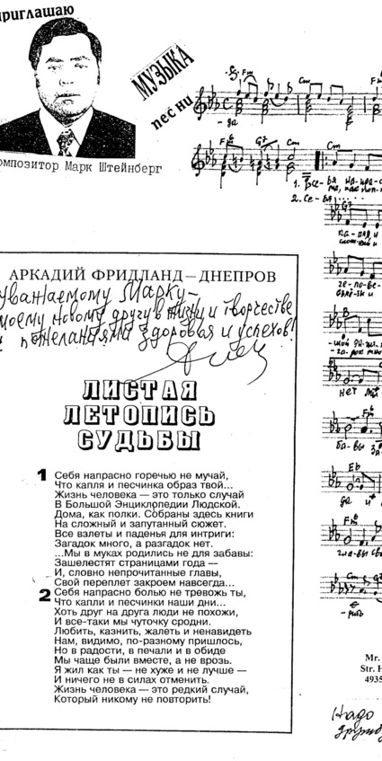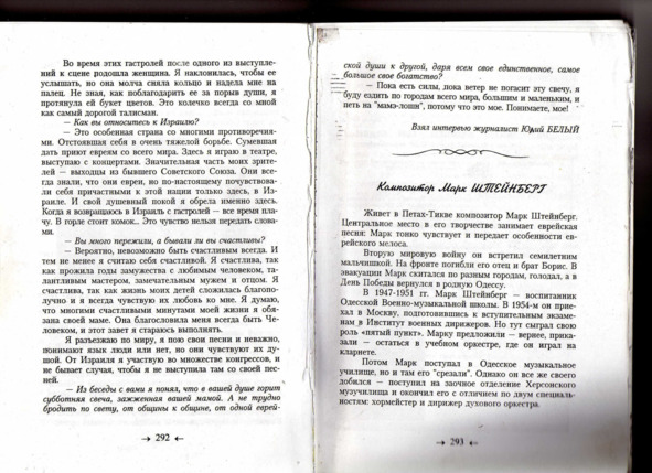 – В «титрах» моих воспоминаний израильского периода жизни Марк Штейнберг – автор многих прекрасных песен не только на русском языке, но и на языке идиш, автор музыкальных сборников, статей и рассказов. О Марке Штейнберге нередко пишут в израильской, украинской и американской прессе.