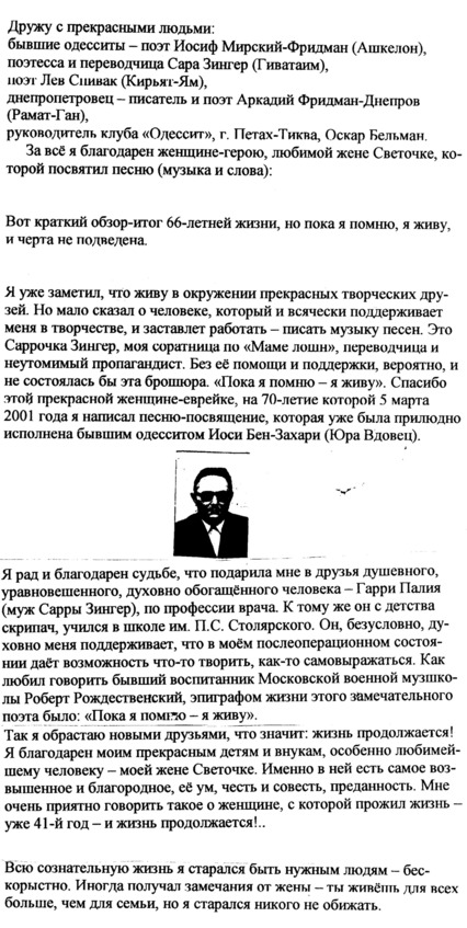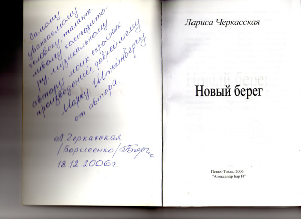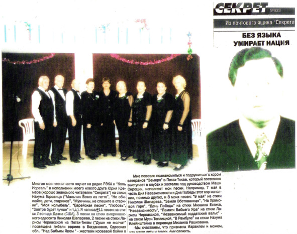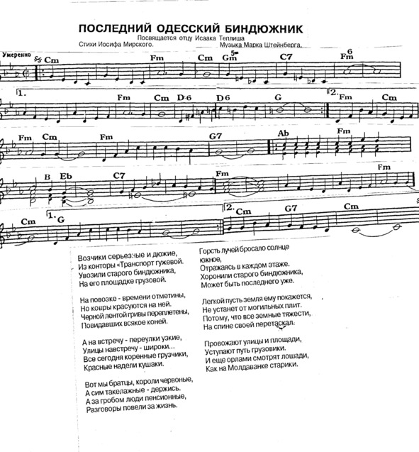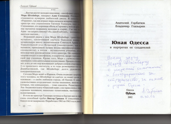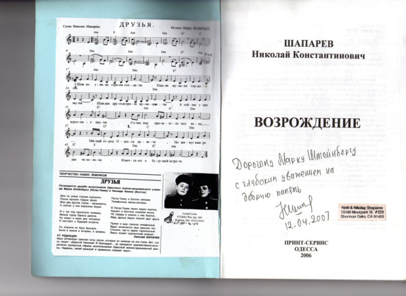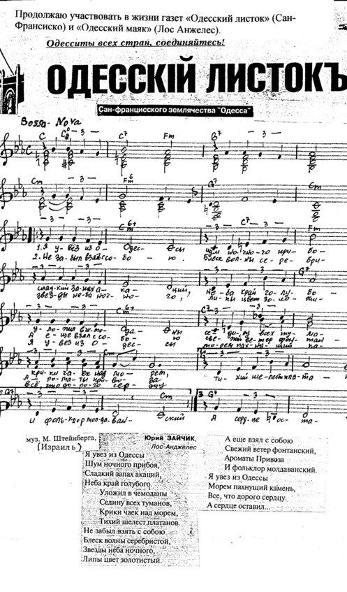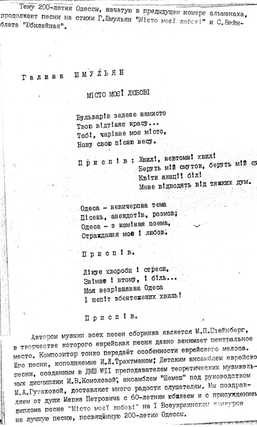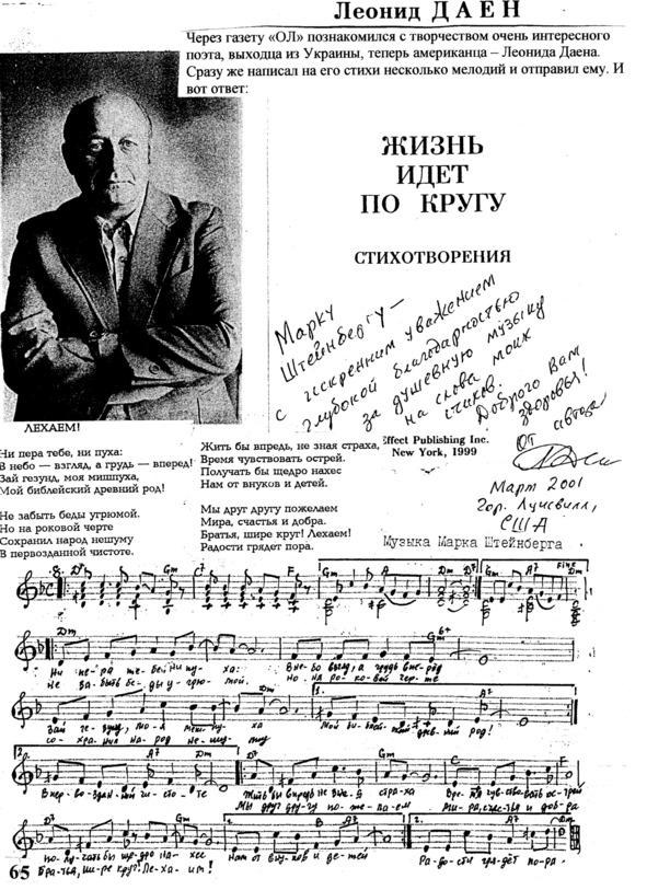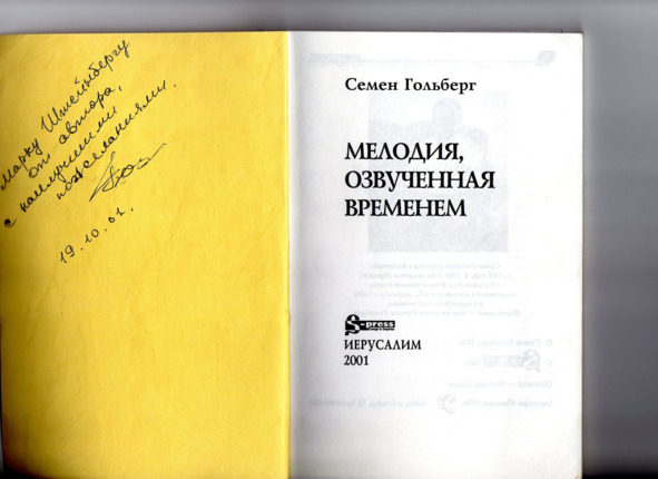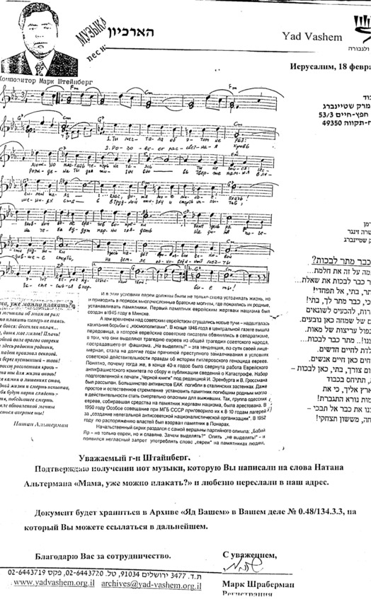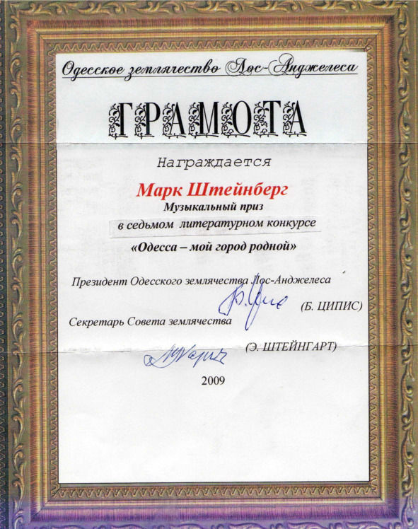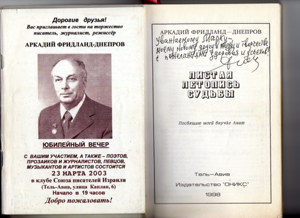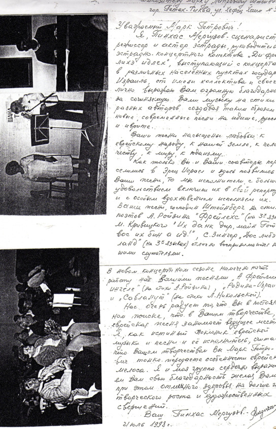– В «титрах» моих воспоминаний израильского периода жизни Марк Штейнберг – автор многих прекрасных песен не только на русском языке, но и на языке идиш, автор музыкальных сборников, статей и рассказов. О Марке Штейнберге нередко пишут в израильской, украинской и американской прессе.