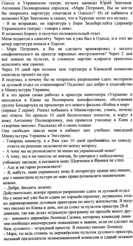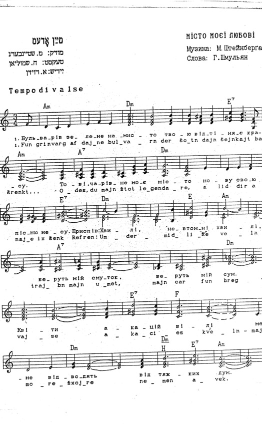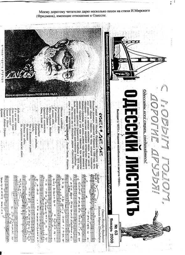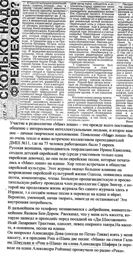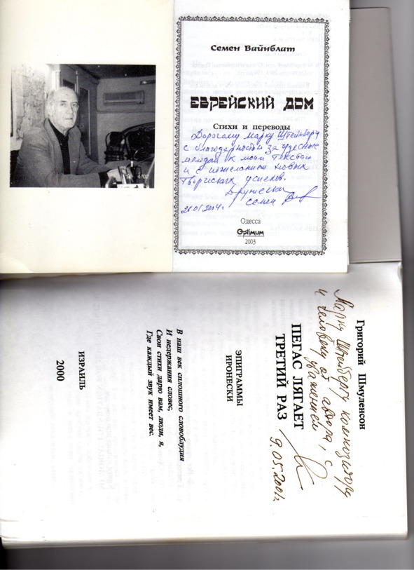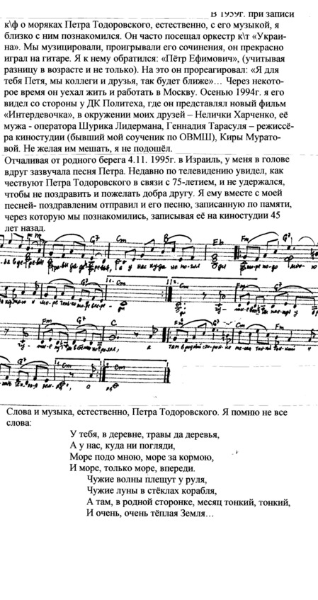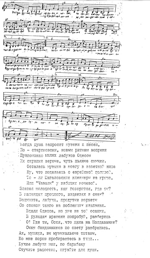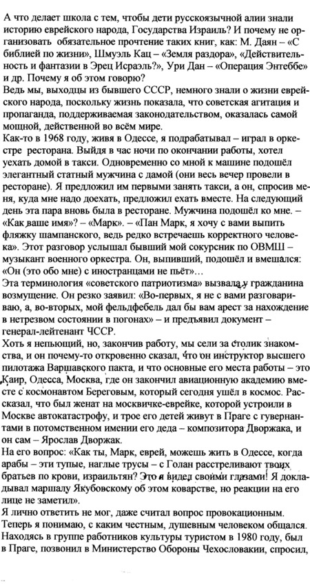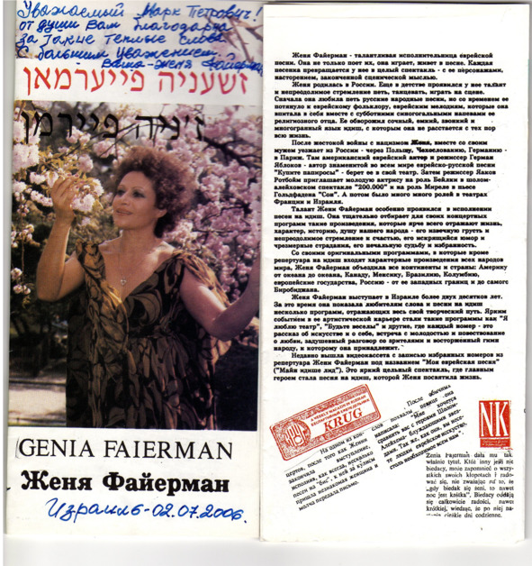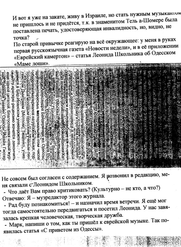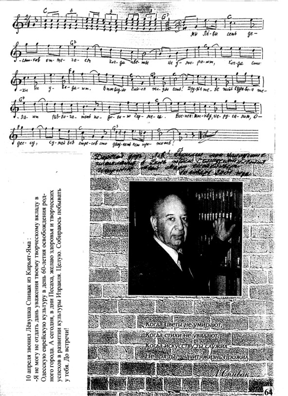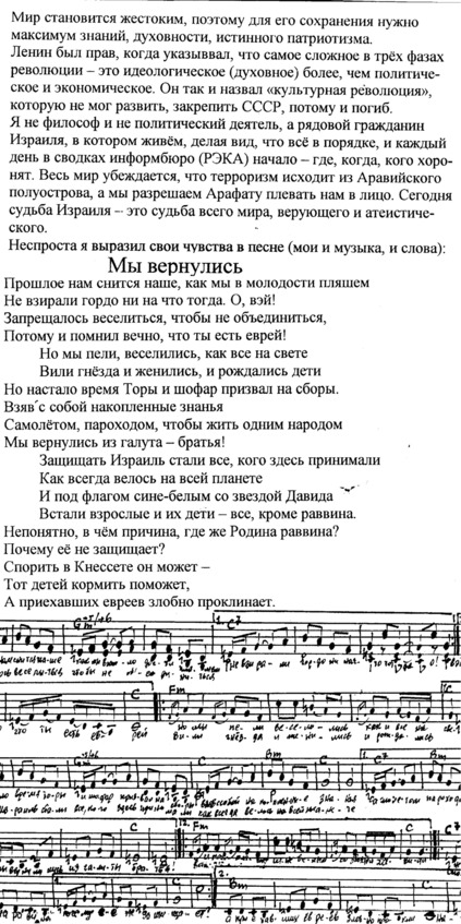 – В «титрах» моих воспоминаний израильского периода жизни Марк Штейнберг – автор многих прекрасных песен не только на русском языке, но и на языке идиш, автор музыкальных сборников, статей и рассказов. О Марке Штейнберге нередко пишут в израильской, украинской и американской прессе.