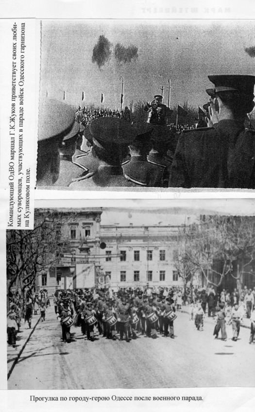 1947 год. Марк принимает участие в военном параде в Одессе. Маршал Георгий Жуков приветствует своих любимых воспитанников.