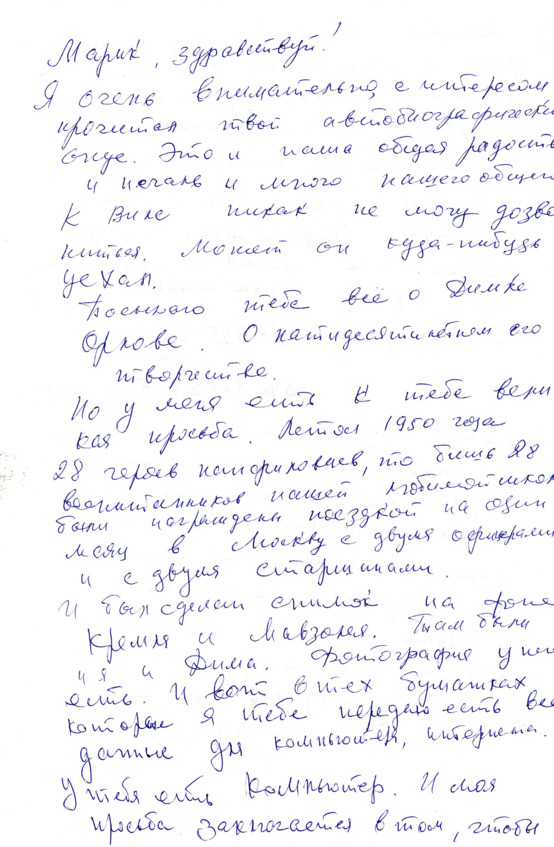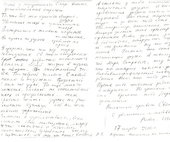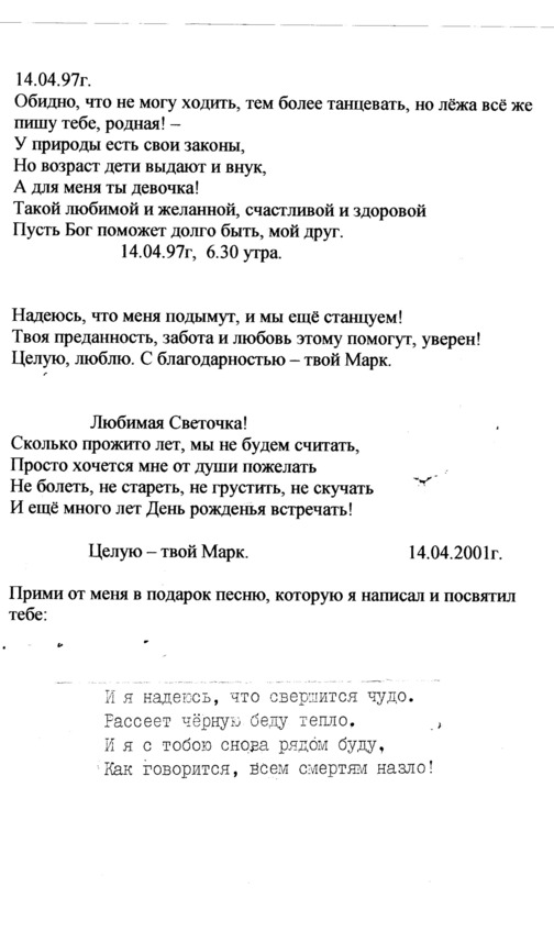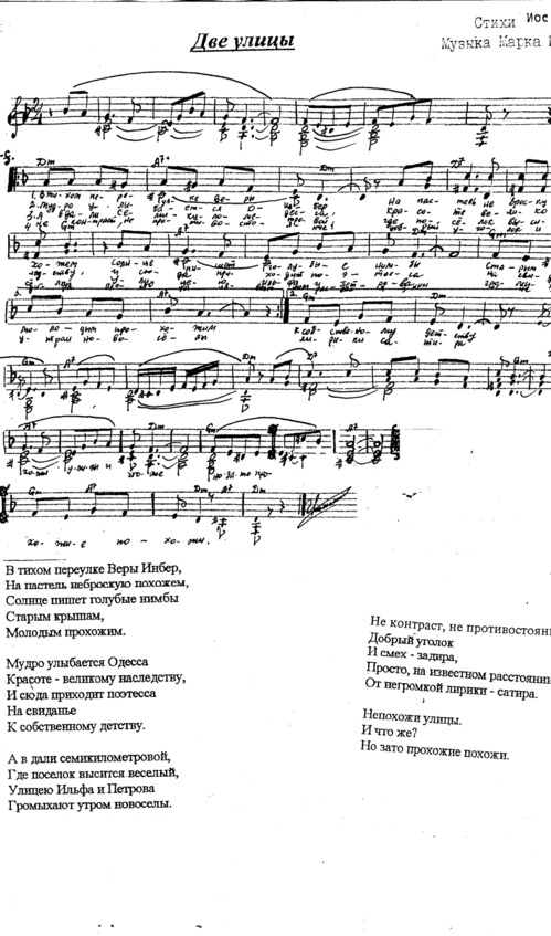 Когда меня представили этому талантливому музыканту, я принял это как большую честь. Нас познакомил столь же талантливый и интересный его коллега Юрий Кремер. Союз наш скрепило согласие этих людей написать песни и романсы на мои стихи. Мне по душе была работа с композиторами, столь органичными в совместном творчестве. Перенесший тяжелые операции и поэтому ограниченный в своих физических возможностях, Марк называет Юрия, помогающего ему в обработке и исполнении произведений, «мой добрый ангел».