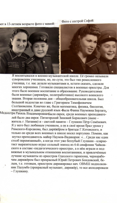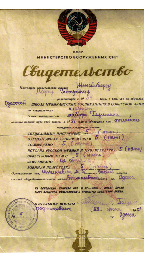 Мальчиком Марик Штейнберг стал воспитанником Одесской военной школы музыкантских воспитанников, что сродни суворовскому училищу. Готовили в ней военных музыкантов. В то же время, там были все положенные средней школе общеобразовательные предметы. Школа находилась под особым вниманием маршала Г.К.Жукова, так как именно он предложил Сталину идею основать эти учебные заведения, а попросту хоть немногих детей спасти от голода и вырвать их из паутины беспризорности.