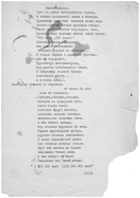 Идёт по улицевзбесившийся торшер,и лысина прозрачной лампы в абажуре.Оранжевые лампочки,накинув шёлка шаль,спешат,блестя ногами в розовом гипюре.Глаза зелёно-жёлтые подъездных ламппронзительно зелёныесквозь синий штамп:«200 ватт, 220 вольт».Люминесцентные, площадные,как дамы степеннейшие, дорогие —холодной парчой по мостовой…И старый фонарь с жёлтой тростью —как городовой.Прожекторы – интеллектуалыпод нимбом собственного света.И канделябр зелёной бронзыволосатого поэта в потёках свеч…Навстречу – огоньки от паровоза.На шпалы бы лечь…Меня не понимают…Осколки, осколки, осколки…Погнута из вольфрама нить.Поэты, поэты, поэтыторшерами будут светить.Зелёными лампами взгляда.Интимностью ласковых свеч.А мне ничего не надо —под огоньки паровоза бы лечь.Рыдают хрустальные люстры.Грустят огоньки светлячков.И вздох керосиновой лампы —как запах забытых стихов.Идут, как ни в чем не бывало,чиновники тонких ламп.А мне ничего не надо!Раздавлен мой синий штамп:«1000 вольт. 100 000 ватт».Слова и вороны