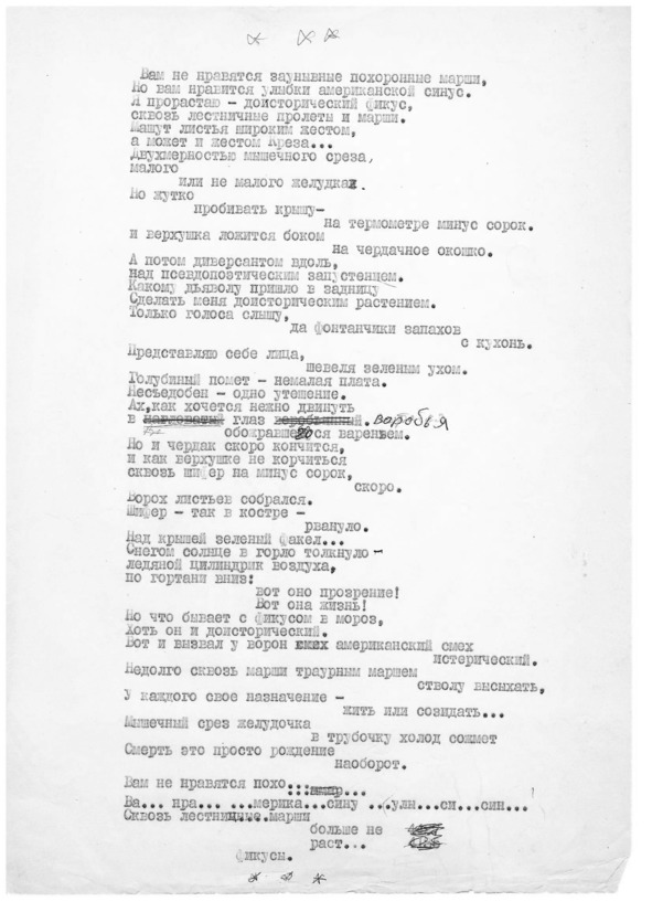 Вам не нравятся заунывные похоронные марши.Но вам нравится улыбки американской синус.Я прорастаю – доисторический фикус —сквозь лестничные пролёты и марши.Машут листья широким жестом,а может, и жестом Креза.Двухмерностью мышечного срезамалого или не малого желудка.Но жуткопробивать крышу:на термометре – минус сорок.И верхушка ложится бокомна чердачное окошко.А потом диверсантом – вдоль,над псевдо-поэтическим запустеньем.Какому дьяволу пришло в задницусделать меня доисторическим растением!Только голоса слышуда фонтанчики запахов с кухонь.Представляю себе лица,шевеля зелёным ухом.Глубинный помёт – немалая плата!Несъедобен – одно утешение.Ах, как хочется нежно двинутьв глаз воробья, обожравшегося вареньем.Но и чердак скоро кончится.И как верхушке не корчиться,сквозь шифер на минус сорок —скоро.Ворох листьев собрался.Шифер – так в костре – рвануло.Над крышей зелёный факел…Снегом солнце в горло толкнулоледяной цилиндрик воздухапо гортани вниз.Вот оно, прозрение!Вот она, жизнь!Но что бывает с фикусом в мороз,хоть он и доисторический?Вот и вызвал у воронамериканский смех истерический.Недолго сквозь марши траурным маршемстволу высыхать.У каждого своё назначение —жить или созидать…Мышечный срез желудочкав трубочку холод сожмёт.Смерть – это просто рождениенаоборот.Вам не нравится похо…Ва… нра… мерика…Больше не раст…Фикусы.