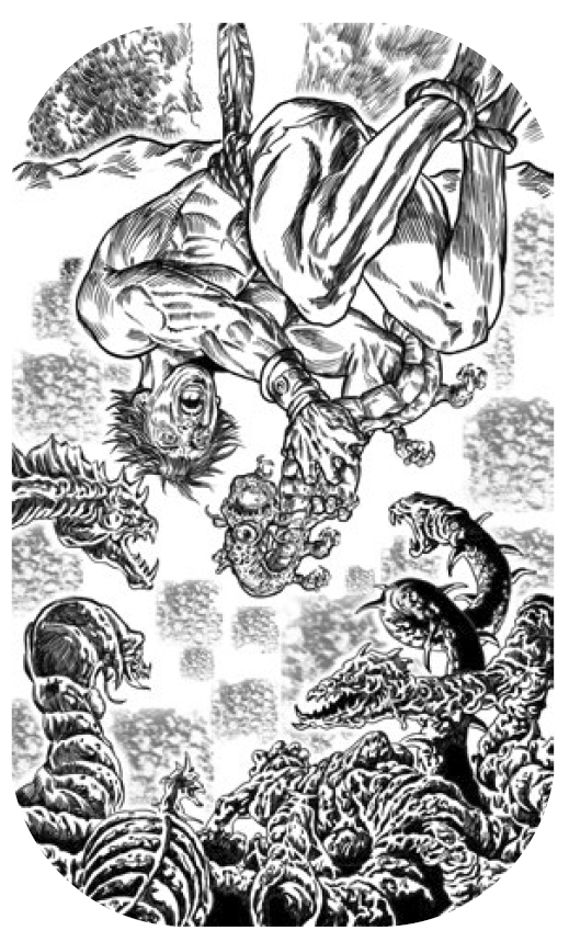 И вот крепкая лиана намертво обхватила поясницу шамана, другой конец лианы перекинули через специально изготовленную перекладину, находящуюся над ямой, кишащей гигантскими многоножками, и несколько самых ответственных исполнителей, стоящих по иную сторону перекладины, осторожно потянули лиану на себя. Шаман был поднят в воздух и только тут окончательно понял весь ужас происходящего. Повиснув метрах в трёх над ямой и увидев готовых растерзать его мерзких насекомых, он взвыл от ужаса, умоляя палачей избавить его от страшной участи. Однако его мольбы ещё пуще раззадоривали публику.
