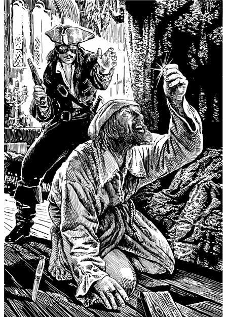 – Слушай меня, Мак-Райль! Я пришел либо взять камень или деньги, либо убить тебя. Даю тебе одну минуту. Я буду считать до шестидесяти. Вставай, зажги вторую свечу и не вздумай хитрить! На счете «шестьдесят» я размозжу тебе череп, если камень или деньги не будут у меня в руках.