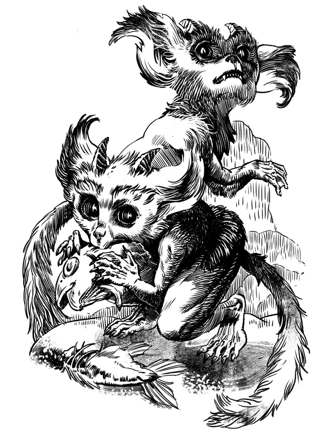 Морские чертята часто селились в южных теплых водах, в портах и верфях. Промышляли они воровством еды, товаров, а порой и всего ценного и блестящего, до чего дотягивалась их перепончатая тонкая лапка. С этими демоническими безобразниками, весьма безобидными, если бы не их проделки, отчаянно воевало портовое управление, однако шустрых негодников изловить было очень непросто. Отличались эти создания от своих лесных собратьев, киабу, не таким пушистым хвостом, а также перепонками между пальцами. За долгие годы соседства с людьми морские чертята стали еще нахальнее. Не раз и не два любая мало-мальски пригодная щель в стене или полу становилась причиной разорения амбаров. Порой отопрет хозяин склада дверь поутру и тут же увидит в полутьме, как к щели наружу устремляются стрекочущие и довольные черти, деловито поворачиваясь к разорившемуся человеку тощим задом. Почему разорившемуся? Потому что шелка, парусина, красители-то, может быть, и не съедобные, но пока каждый демонический негодник не попробует их на свой зуб, не пожует, не выпотрошит и не выплюнет, он с этим будет до последнего не согласен. Впрочем, портовый люд в долгу не оставался: с медком да под пиво вяленые чертята шли очень даже неплохо. Так что тут, как говорится, око за око, зуб за зуб.