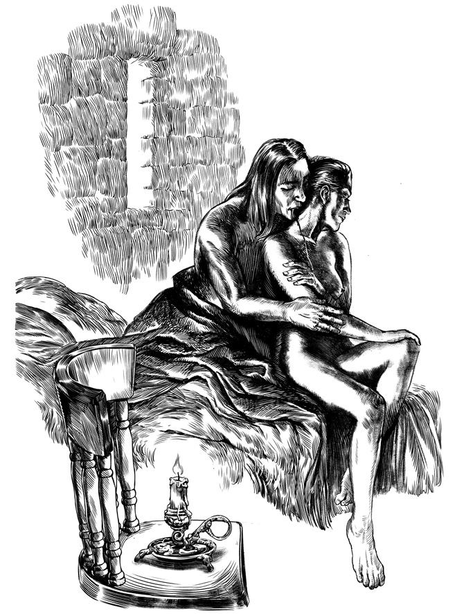 Герцог вскинул в негодовании бровь. Ленивым движением он перекатился по простыне, заляпанной кровью, и сел на край широкой деревянной постели – бывшего ложа Райгара Хейм Вайра. Он дождался, когда Йева наденет любимое шерстяное платье и приколет к груди серебряную брошь с вороном, потом взглянул выжидающе и стрельнул глазами в сторону стула, где лежали его вещи. Со вздохом Йева взяла халат и надела его на любовника. Она уже привыкла к прихотям Горрона, который поначалу казался куда более интеллигентным, чем был в действительности.
