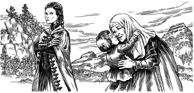 Из-за деревьев к площадке спустился молодой поселянин, лет двадцати на вид. Немного полный, но с виду смирный, добрый, он нашел глазами Линайю и облегченно выдохнул. За его спиной высились на целую голову стражники. А внизу, из-за его ноги, выглядывало совсем крохотное дитя с ясными, невинными глазками.