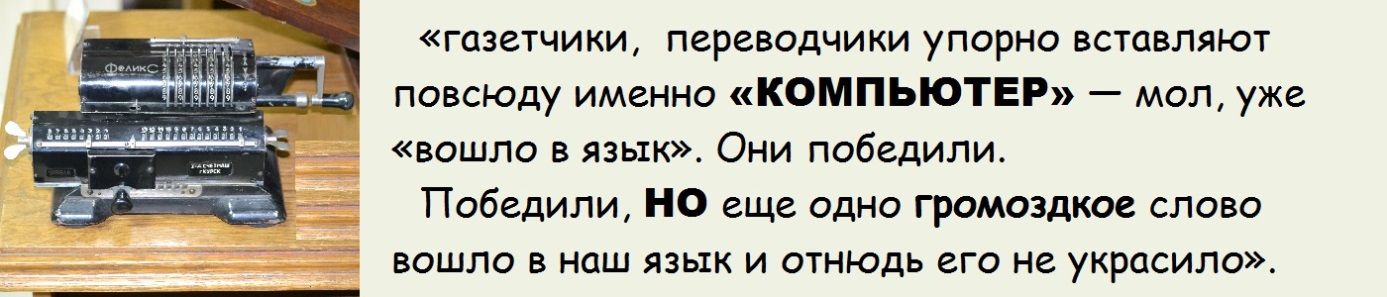 Допустим, специалисту – инженеру, физику, математику – недосуг вдумываться, какое название, какой термин лучше. Тут бы вмешаться «специалисту» языка – поправить, подсказать хорошее, убедительное слово, родственное нашим привычным – мыслитель, ракета-носитель. Но нет, газетчики, популяризаторы, переводчики упорно вставляют повсюду именно «компьютер» – это, мол, уже «вошло в язык», «у нас так говорят». Они победили, еще одно громоздкое слово вошло в наш язык и отнюдь его не украсило».
