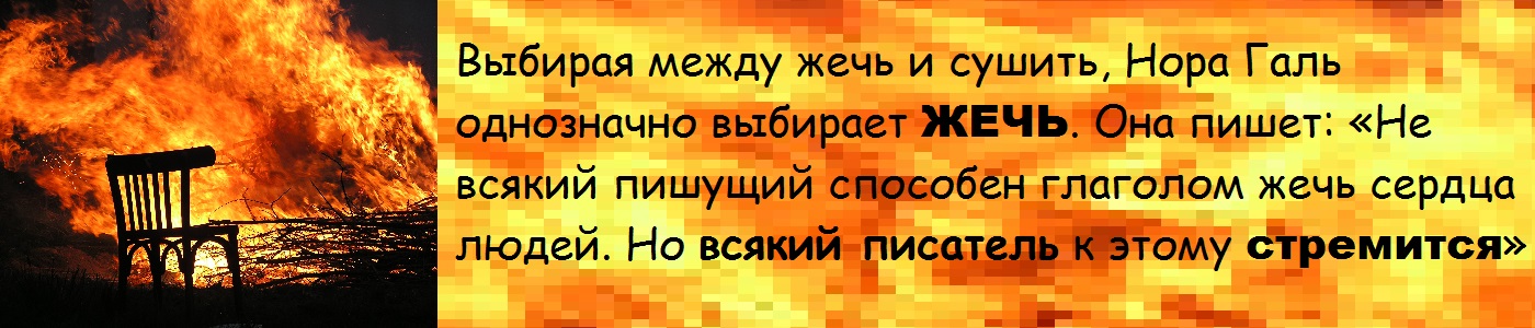 Так называется второй параграф первой главы книги. Выбирая между жечь и сушить, Нора Галь однозначно выбирает ЖЕЧЬ. Она пишет: «Не всякий пишущий способен глаголом жечь сердца людей. Но всякий писатель к этому стремится».