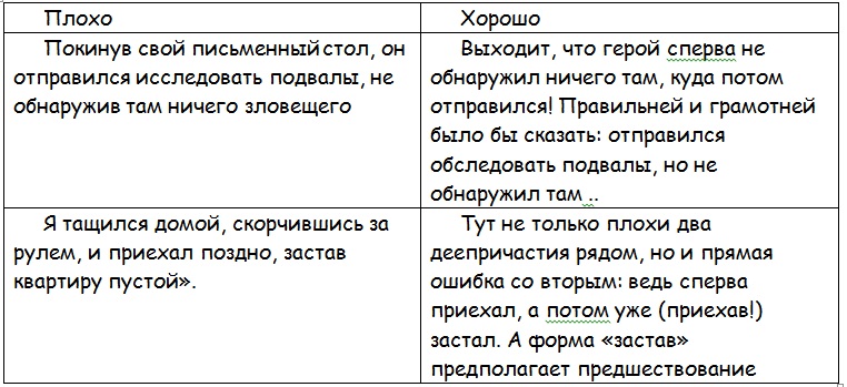 Нора Галь считает, что «причастиями надо пользоваться с оглядкой. Два-три деепричастия в одной фразе, особенно в сочетании с причастиями, почти всегда тяжелы и неестественны, затрудняют восприятие.