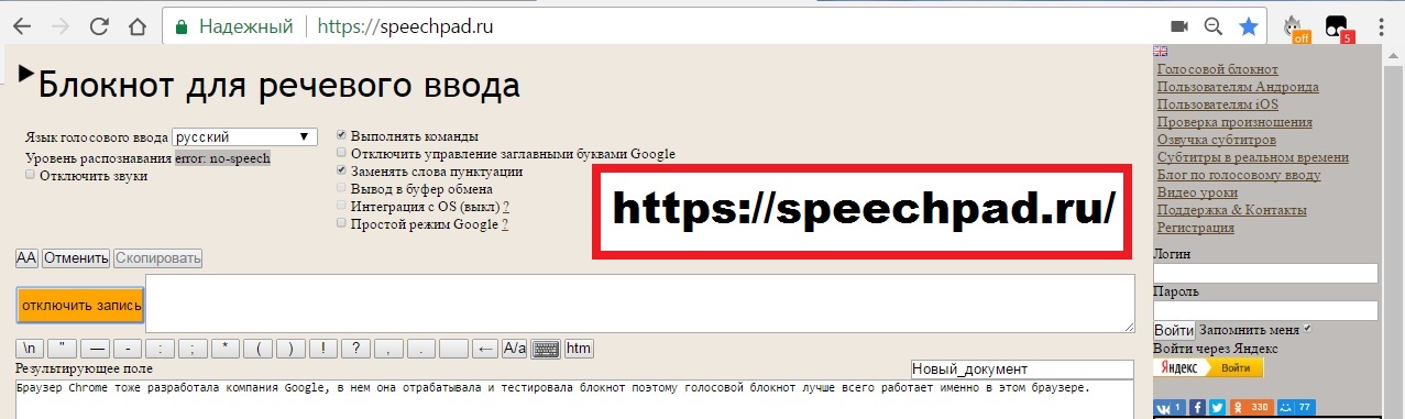Если ваша скорость печатания меньше, не расстраивайтесь, это не значит, что путь в копирайтеры вам заказан. Отнюдь нет. Не пытайтесь повысить свою скорость, проходя какие-нибудь курсы печатания «слепым десятипальцевым» способом, изучая самоучители и осваивая тренажеры. Это всё не нужно. Если ваш компьютер или ноутбук оснащен микрофоном, то откройте привычный для вас интернет-браузер. Лучше всего, если это браузер Chrome. Наберите в адресной строке https://speechpad.ru/: вы попадёте в, так называемый, «Голосовой блокнот» или «Блокнот для речевого ввода» от компании Google. Браузер Chrome тоже разработала компания Google, в нем она отрабатывала и тестировала блокнот, поэтому голосовой блокнот лучше всего работает именно в браузере Chrome.