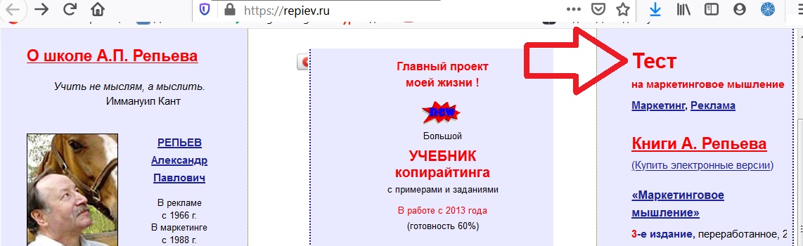 Тексты на его сайте https://repiev.ru/ – как кекс с изюмом, интеллектуальные изюминки рассыпаны тут и там: «учить не мыслям, а мыслить», «материалы курса понятны даже студенту», «маркетинг и реклама – это интеллектуальные практические ремесла», «мой курс – это не столько учебник, сколько задачник».