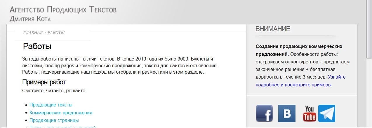 Пример доведенной почти до абсолюта лаконичности даёт сайт другого классика отечественного копирайтинга, известного специалиста по отстройке от конкурентов, Дмитрия Кота. В его разделе «Портфолио» нет практически ничего, кроме самого «портфолио». Ни картинок, ни баннеров, ни анимации, ни кликабельных кнопок, ни призыва к действию, ни дедлайнов, ни триггеров. Ни-че-го !! Предельно лаконичная констатация: «За годы работы написаны тысячи текстов. В конце 2010 года их было 3.000.»