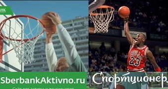 А справа на снимке звезда национальной баскетбольной ассоциации Майкл Джордан, по кличке Air, то есть «воздушный». Видно, что ему нелегко, но он тоже сумел подпрыгнуть на целый метр. Майкл Джордан – на метр, и российский спортционер – тоже на метр. Учитывая возраст, пожалуй, Джордан российскому пенсионеру позавидует.
