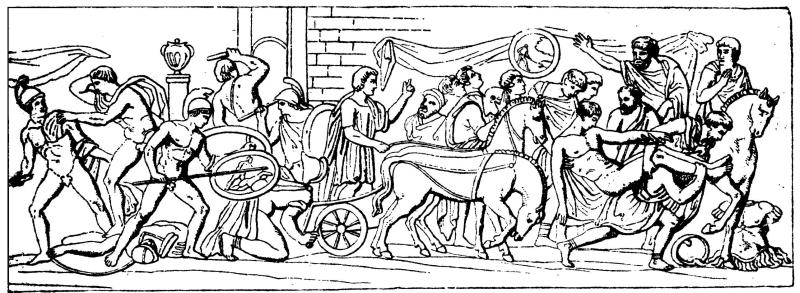 Так коснел Мелеагр в злобе до тех пор, пока не потрясся его собственный дом от ударов вражеского оружия, пока куреты не взошли на городские башни и не начали жечь великий город. Рыдая, стала тогда молить Мелеагра жена его и исчисляла перед ним все бедствия, которым подвергается взятый врагами город: режут воины граждан, предают огню жилища и людей и толпами уводят в плен детей и женщин.