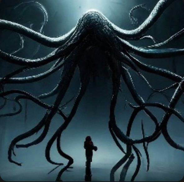 Я оглянулся, но никого не было. Я немного отошёл от трубы, вдруг послышался странный скрежет по металлу. Потом передо мной появилось очень страшное существо. Оно выглядело как очень худой и длинный человек, его ноги были очень широко расставлены дугой, очень длинные пальцы, из головы развивались чёрные, длинные щупальцы. С каждой секундой двигаться становилось всё тяжелее. В глазах мелькали надписи: