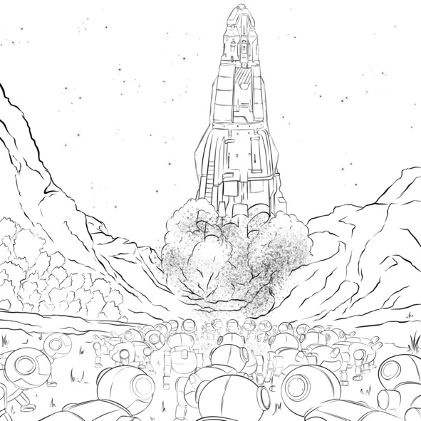 Корабль начал медленно подниматься. На радаре было видно, как точки приближались и становились всё ближе. Когда компаньоны взлетели, яркий луч корабля осветил поляну, на которой были тысячи металлических роботов.
