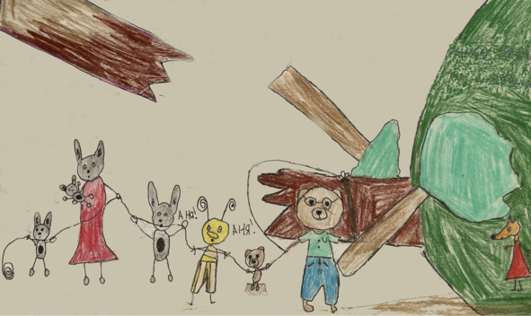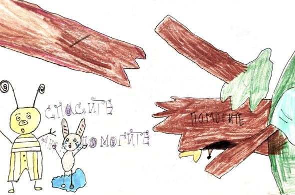 – Дядя Миша, упало дерево, на котором были домики зайчика Мони и белочки Ани, и она осталась в дупле, и, наверное, застряла там! – сказал Пчелёнок.