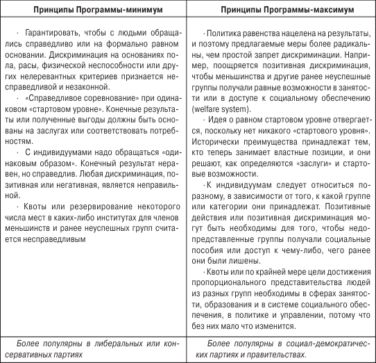 Для реализации политики равных возможностей в современных обществах используются по крайней мере 2 стратегии – «программа-минимум» и «программа-максимум»[15] (таблица 1.1.).