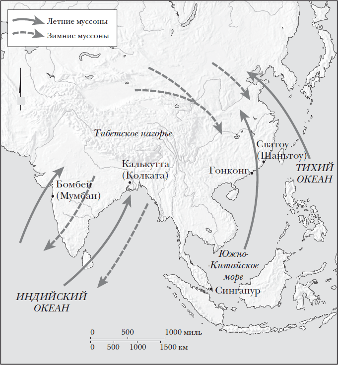 Карта 1.1. На протяжении тысячелетий азиатские муссоны диктовали ритмы торговли и миграции в Индийском океане. Муссоны (от арабского mawsim, что означает «сезон») являются частью сложной серии глобальных погодных явлений, которые приводят к сильным ветрам, дующим преимущественно с юго-запада на северо-восток с апреля по сентябрь и с северо-востока на юго-запад с ноября по март. Деревянные парусные суда XIX века, такие как «Эдвин Фокс», синхронизировали свои действия соответственно этим господствующим ветрам, пока во второй половине XIX века не появились надежные океанские паровые суда. (Источник: Картография Билла Нельсона.)