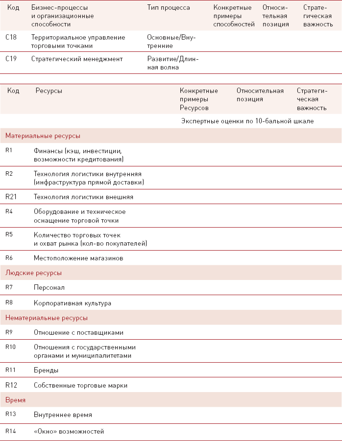 Подобную экспертную оценку для своей компании можно провести командой руководителей с помощью простого шаблона, представленного ниже (см. Таблица 5. Шаблон Таблица оценки ресурсов и способностей). При анализе относительной позиции оценка осуществляется относительно лучшего прямого конкурента, стратегическая важность – относительно ключевых факторов успеха в отрасли и стратегии компании.