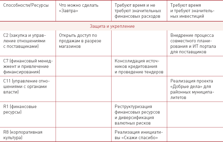 Например, в рассматриваемом случае диаграммы «Стратегической важности и относительной силы» были сформулированы следующие инициативы по улучшению и защите, смотрите таблицу ниже.