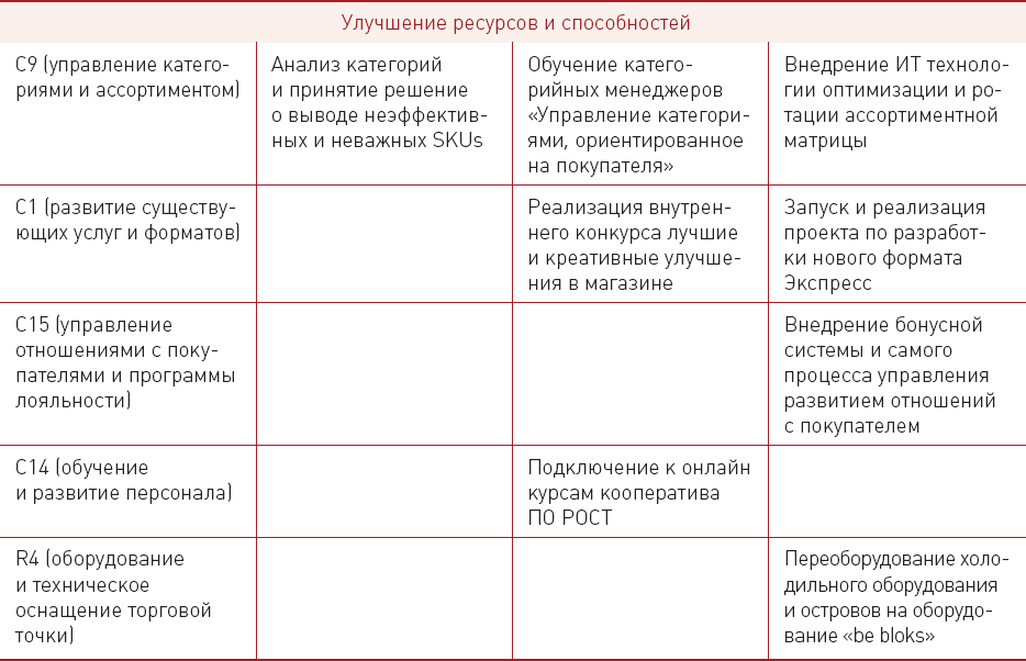 Анализ и развитие ключевых компетенций и ресурсовНе все способности и ресурсы розничной компании являются релевантными и представляют собой источники конкурентного преимущества [11]. Поэтому важно провести анализ и выделить те способности и ресурсы, на которые можно опереться уже сегодня, и те, которые необходимо срочно «подтягивать» до нужного уровня, так как они являются стратегически важными для успеха. Обычно для анализа сильных и слабых сторон используется SWOT-анализ. Это хороший инструмент для общего размышления в контексте связки с внешними факторами. Для анализа ресурсов и способностей на практике лучше работает диаграмма «Стратегической важности и относительной силы». В качестве примера ниже представлена диаграмма, которая получена на основе экспертной оценки способностей и ресурсов, сделанной командой руководителей розничной компании, где С – это способность, а R – это соответствующий ресурс. Мы видим, что в этом примере у компании сильно развиты способности C2 (закупка и управление отношениями с поставщиками), C7 (финансовый менеджмент и привлечение финансирования), C11 (управление отношениями с органами власти) и в достаточном количестве имеются ресурсы R1 (финансовые ресурсы) и R8 (корпоративная культура). При этом эти способности и ресурсы являются стратегически важными. С другой стороны, компании необходимо срочно развивать и наращивать компетенции и ресурсы C9 (управление категориями и ассортиментом), C1 (развитие существующих услуг и форматов), C15 (управление отношениями с покупателями и программы лояльности), C14 (обучение и развитие персонала), R4 (оборудование и техническое оснащение торговой точки).