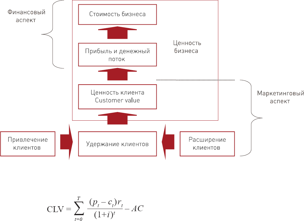 Для оценки ценности клиента применяется следующая формула, учитывающая затраты и фактор времени (смотрите Рисунок 15), где T – время «жизни» клиента, жизненного цикла клиента в компании, pt – средняя цена, которую платит клиент в момент времени t, ct— прямые затраты на обслуживание и поддержку отношений с клиентом в момент времени t, rt – вероятность удержание клиента, AC – стоимость привлечение данного клиента (или группы клиентов).