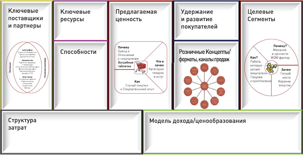 9 ключевых областей бизнес-модели розничной компанииНиже представлена канва бизнес-модели, которую предложил Александр Остельвардер в книге Business Model Generation [22]. На протяжении 5 лет мы активно и успешно используем этот шаблон для систематизации ключевых идей по изменению и улучшению бизнес-модели розничной компании, в том числе при проведении мозговых штормов и воркшопов.