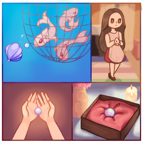 Пообедав, девчушка принялась рассматривать странную рыбью голову, словно искала включатель, который поможет рыбе заговорить. Для этого она даже приоткрыла рот рыбы пальчиками. И – о чудо! – там девочка увидела прекрасную жемчужину! Девочка ожидала чего-то необычного и нашла это. Тогда она воскликнула: