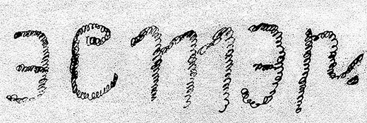 …Можете считать это за шутку, но до Вас я любил по-настоящему один раз. Это была Эстер (в переводе на русский Звезда). <…> Она была для меня не только женщиной, которую я люблю, но и еще чем-то другим, что входило во все мои мысли и дела. Я называл ее окном, сквозь которое я смотрю на небо и вижу звезду. А звезду я называл раем, но очень далеким. Мы разговаривали с Эстер не по-русски, и ее имя я писал латинскими буквами – ESTHER. Потом я сделал из них монограмму, и получилось