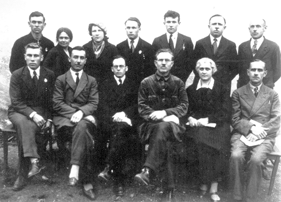 Стоят: Якоб Манн, Марта Фризен, Дора Шрам (моя учительница в 1938 г.), Роланд Миссаль, Вальдемар Фельзингер, Генрих Ландиз, Фридрих Вальтер.