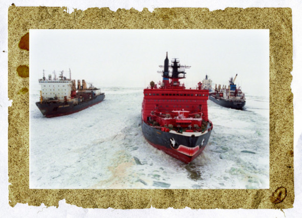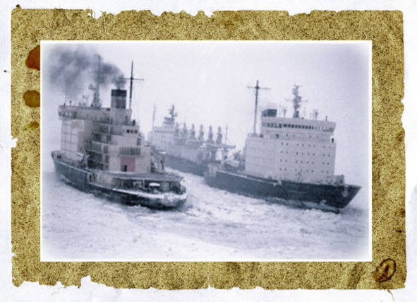 Борис Гребенщиков & группа «Аквариум», песня «Боже, храни полярников» из альбома «История Аквариума. Архив, том III»Впереди маячил мощный торс атомного ледокола «Россия». Мы двигались за ледоколом, разбивая остатки льдин и расчищая путь для каравана.