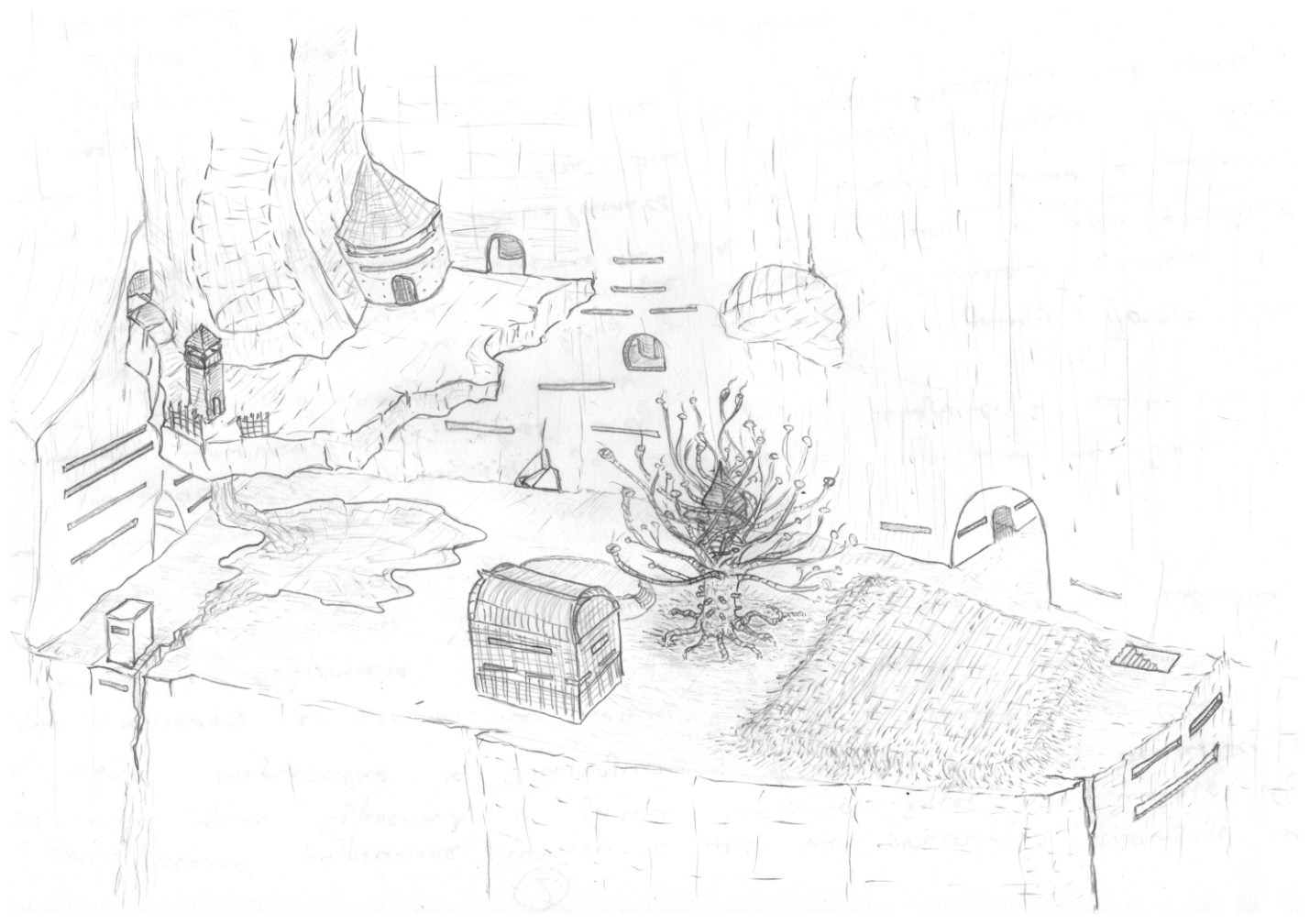 Дна тоннеля не было видно. Часть этой ниши была скрыта под скальным козырьком. В центре располагалось огромное стрекательное дерево с дворцом, вплетенным в стрекательные ветви, сам Дворец был также сплетен из ветвей. Весь Дворец представлял собой несколько уровней инкубаторов с яйцами, ждущими оплодотворения. На самой вершине Дворца, прямо под крышей, был довольно просторный Тронный Зал с панорамным окном. Из Зала был выход на балкон, который был обращен к озерцу под скальным козырьком. Когда улей рос, а отмеченным гифом разрешили основать побочные ветви семейств, заключив договор с Великой Матерью, в скалах было выдолблено множество комнат, галерей, коридоров и многие уровни жилых комнат и секретов со множеством жилищ, принадлежащих побочным семьям целиком. Прямо под озерцом на козырьке были установлена смотровая башня, чтобы предупредить атаки, и бастион, для того чтобы сокрыться в момент нападения врагов, коих множество, будь они со дна тоннеля или с его потолка. На козырёк вели две лестницы, вырубленные в скале, а также склады, оружейные, арсеналы. Справа от Дворца недалеко от края ниши расположился бастион для защиты от внезапной атаки на Дворец, принадлежащий побочной семье Кту-Аз. Они первые, кому разрешили основать Род, и их приближенность к Древу почетна. Насекомые этого Рода служат усмирителями Древа, «отводящими» вечно рыскающий в поисках добычи чувствительный волосок.