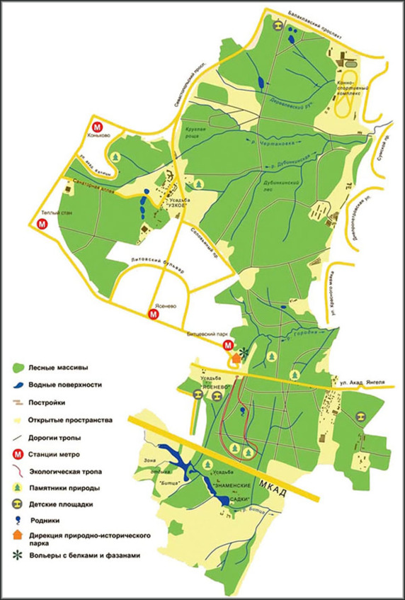 Парк включает объекты культурного наследия: каскад Каменских прудов и Мичуринский сад, который создан в 1936 году и известен вишнями, грушами, яблонями, цветочными панорамами из тюльпанов, бегоний, петуний и виол. В Дубовой роще размещена единственная в Москве воздушная экотропа.