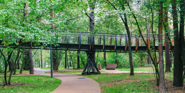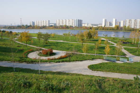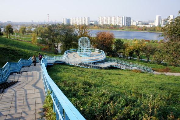 От улицы Борисовские пруды к парку и дальше к набережной проложены многоступенчатые мостики и пандусы.