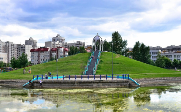 Самое заметное место – искусственная горка на берегу пруда, увенчанная ротондой. Зимой горка используется для катания на снегокатах и санях.