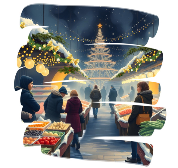В ночь на первое декабря рынок преображается: прилавки становятся чище, появляются новогодние украшения, елочки в горшочках и большая ель в центре рыночной площади. Вывески яркие, праздничные, под старину.