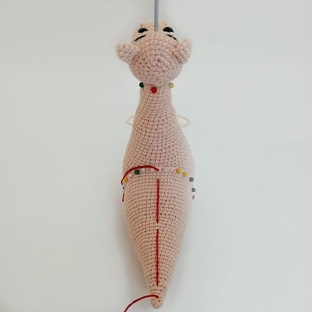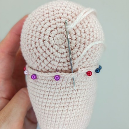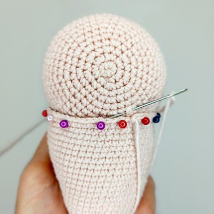 Примечание 1: Необходимо обязательно вводить иглу в те же отверстия, что и до этого. В этом случае узелок, оставшийся от вязания, незаметно спрячется во внутрь игрушки.