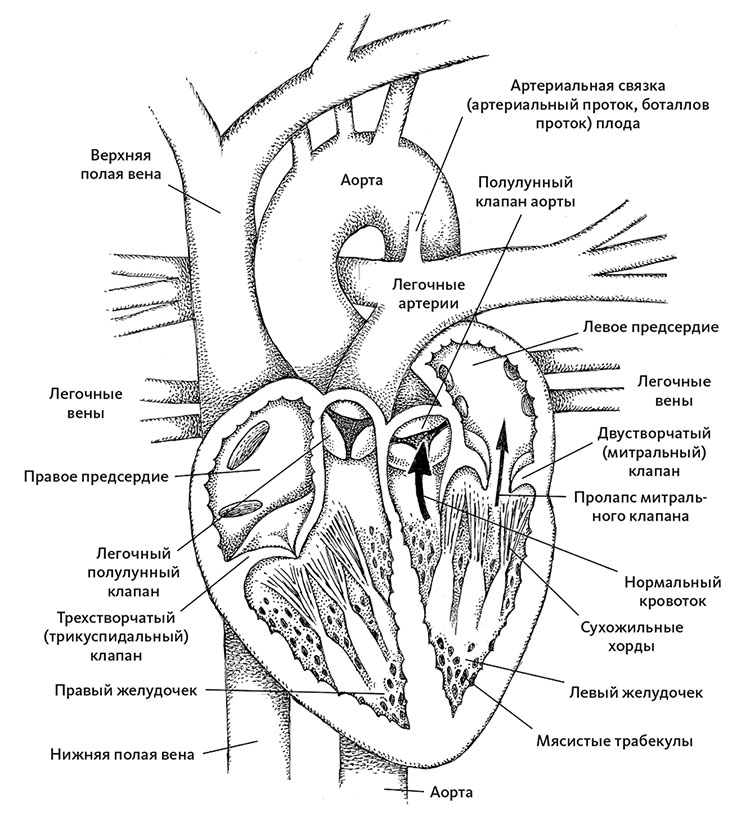 Чтобы представить себе это, вообразите собаку в ошейнике, привязанном к длинному поводку, другой конец которого воткнут в землю. Собака (представляющая створки клапана) может двигаться только до тех пор, пока поводок (chordae tendineae) не натянется, не позволяя пройти в открытые ворота. У людей термин «пролапс атриовентрикулярного клапана» означает состояния, когда одна или более его створок выпячиваются в предсердие (как растянувшийся от постоянного дерганья собачий поводок, который в конце концов пропускает пса за ворота). Поскольку этот пролапс разрушает изоляцию между предсердием и желудочком, во время сокращения часть желудочковой крови «срыгивается» обратно в предсердие, вместо того чтобы покинуть сердце, как должно быть в норме. Эти так называемые «прогибающиеся» клапаны могут появиться после инфаркта миокарда, инфекций наподобие бактериального эндокардита (который часто обнаруживают у людей, употребляющих наркотики внутривенно) или ревматизма – ныне редкого осложнения нелеченой стрептококковой ангины или скарлатины. Пролапс митрального клапана бывает и врожденным.