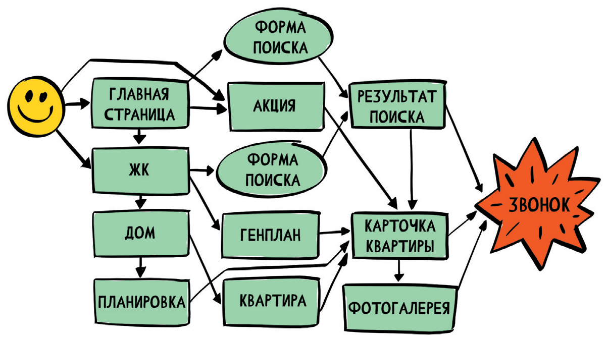 На основании диаграммы пользовательского потока можно спроектировать структуру разделов сайта так, чтобы основные сегменты аудитории тратили минимальное количество энергии для достижения результата.