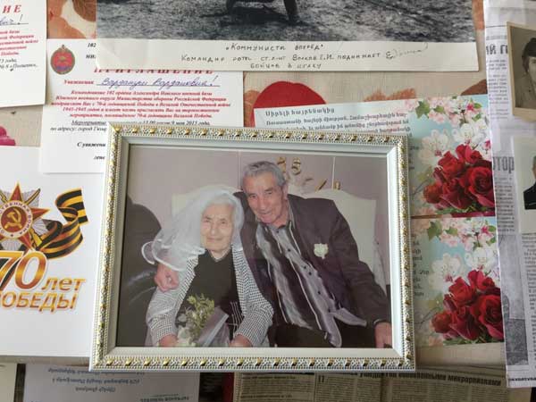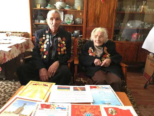 …К нашей встрече они подготовились: разложили на столе дипломы, грамоты, благодарности, а на костюмах медали – боевые и трудовые. На двоих у них целый арсенал: Орден Отечественной войны I-ой степени, медали «За оборону Кавказа», «За победу над Германией», «За освобождение города Керчь», медали «За добросовестный труд», «Ветеран труда», «Почётный железнодорожник» и другие. Андрей Аршалуйслович шутит, мол, жена выбрала лучшие медали и нацепила на себя, а те, что остались – на нём.