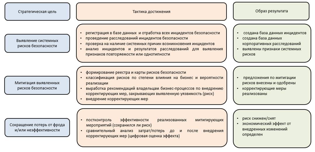 Накопление информации об инцидентах безопасности, их анализ, выявление системных рисков и уязвимостей в бизнес-процессах, выработка и реализация мер по их митигации.